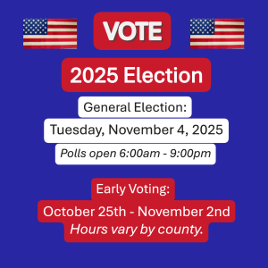 Mark Your Calendar! Tuesday, November 4, 2025 – Election Day Polls open 6:00am – 9:00pm Registration Deadline: October 25, 2025 Make sure you are registered to vote! Check to see if you are registered or register to vote HERE. Registration and Voting Deadlines: HERE Planning to Vote